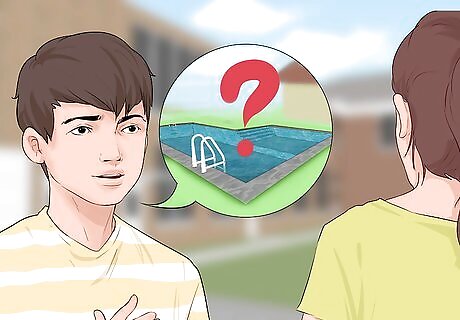 Ask a friend. If you don’t want to pay a monthly fee to swim and you don’t have a swimming pool at home, ask one of your friends if you can use theirs. Offer them something in exchange; for example, you could mow their lawn every week in exchange for pool time. If you make it worth their while they won’t resent seeing you splash around every morning in their back yard. If your friend asks for monetary compensation, it may be worth it to get a gym membership instead. If you’re going to spend money you might as well go to a health club. Don’t skimp on your end of the bargain! Pools are expensive to maintain. Show your friend that you appreciate their generosity.