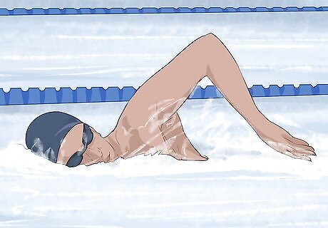 Begin swimming using the front crawl stroke. The front crawl stroke is a swimming form most beginners start with. Place yourself face down in the water. Reach your left arm out in front, pulling it down into the water. Repeat this movement with your right arm and rotate the body from side to side, kicking your legs continuously. Turn your face to the left out of the water to breathe on every left stroke, or vice versa. Bilateral breathing allows you to turn to breathe every three strokes. This lets you turn left and right to breathe. This technique is more complicated but lets you keep your stroke symmetrical. Swim back to your starting point to complete a lap.