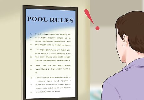 Observe pool rules. Each pool has a different set of rules. Most pools don’t allow diving or running, and many sports pools ask you to shower before entering. If you swim at a pool with signs over the lanes saying “slow,” “medium,” or “fast,” make sure you choose the correct lane for your workout. If you’re a beginner, choose the slow lane. The slow lane is for swimmers who take more than sixty seconds to swim a lap. In general, the medium lane is for swimmers who can swim a lap in 45-60 seconds. The fast lane is for swimmers who can swim a lap in under 40 seconds. To complete a lap, swim from one side of the pool to the other side and back again.