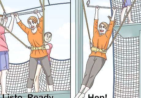 Listen for instructions and learn what specific words mean. If you're new to trapeze swinging, the instructor will be below, shouting out instructions as you leap. Be sure to listen carefully, and wait until you hear the command to jump before you take a flying leap. Typically, the commands are "Listo, Ready, Hep!" "Listo" is when the staff person next to you is saying you're ready. "Ready" is when you prepare to jump, and "hep" gives you the command to jump.