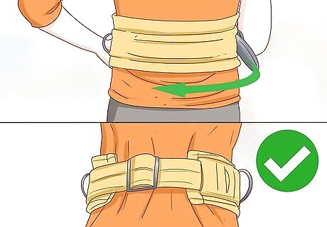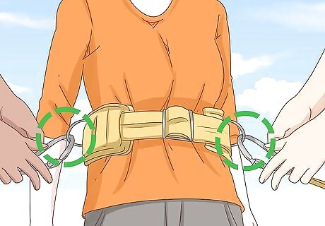 Attach your harness while you're on the ground. Before you climb the ladder up to jump, you'll buckle on a safety harness. This harness usually goes around your waist like a wide belt with a buckle, and it has lunge lines attached to it. These lines are in place to keep you safe if you fall. You should be buckled in before you go up the ladder because you can fall even while you're climbing.