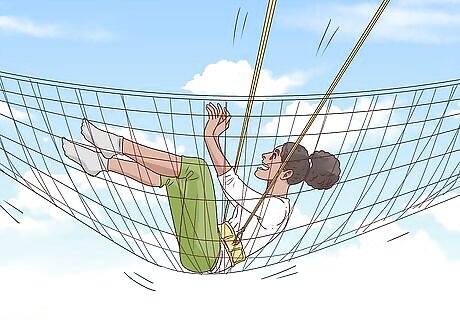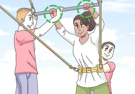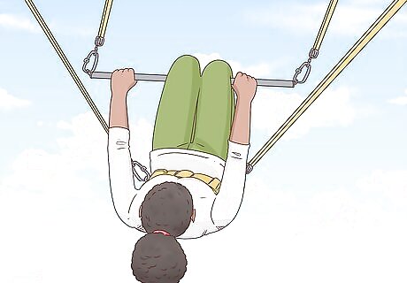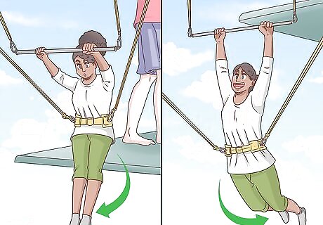 Lean out from the platform to grab the bar. The staff member will hold onto the bar for you, and you'll also have someone behind you keeping you in place. However, you still have to reach out pretty far to grab the bar, which can be a bit nerve-wracking at first. Lean your body out just enough to grab the bar in both hands. If you're more practiced, you may need to hold onto a rope on the platform while you reach out for the bar. In that case, you'll need to hold onto the bar with one hand, and then when you jump, grab the bar with your second hand at the same time. Wrap your thumb around the bar in the opposite direction of your fingers instead of wrapping it next to your fingers. You'll have a better grip this way. Just keep in mind that even if you do fall, you have lines in place to catch you, as well as a net below.