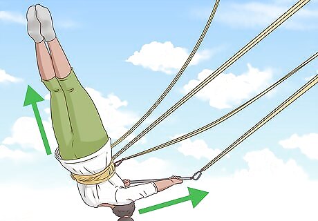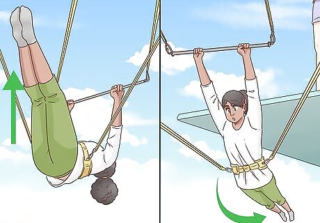 Learn to spot early to advance your trapeze skills. When you're swinging, it can be easy to let your mind wander. However, as you get better at trapeze, you'll really need to be able to see the different parts of the rig to make catches and do tricks, so work on keeping your eyes open and paying attention now. You'll get a sense of where things are, and you'll be ready to take it up a notch when the time comes. For instance, look for the poles, the net, and the other parts of the rig on each swing.