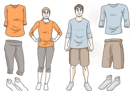 Wear clothes that you can move around in. You're going to need to bend and stretch a lot while you're swinging. This isn't the time for tight, restricting pants. Wear stretchy pants and a shirt that at least covers your shoulders to protect you from the net. Often, you'll be taught to hang upside-down, so try wear something that will mostly stay in place. Keep in mind that you will likely be in your socks while climbing, so wear ones with grips on the bottom if you're worried about slipping. You can also wear soft-soled water shoes or soft dance shoes instead. Pull your hair up into a ponytail if it's long, and don't wear jewelry, as you might lose it.
