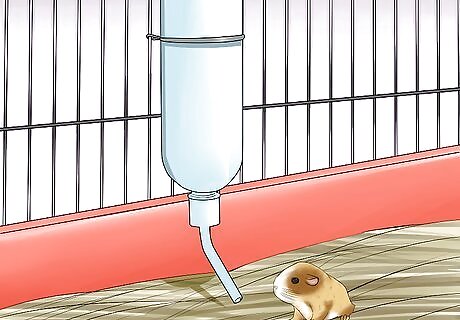 Position a lower water bottle for the pups. Both the mother guinea pig and her pups will need to stay well hydrated. Since the pups are so small, you will need to give them their own water bottle that will be low enough for them to sip from easily. The pups’ water bottle will probably be too low for their mother to sip from, so you should purchase another water bottle and position it at a higher height for her. You may have to go through a trial and error period to determine the ideal water bottle positions for the mother and her pups.
