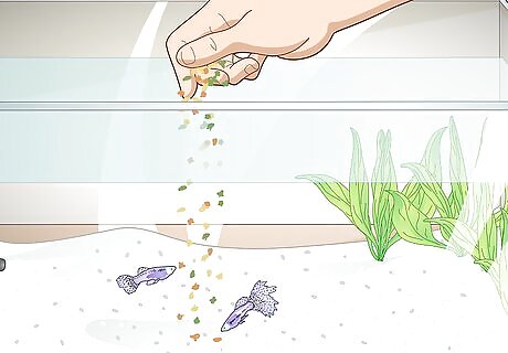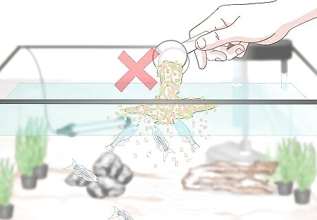 Don’t overfeed. Feeding your fish twice a day with the serving size the size of their eye is usually sufficient. Talk with your vet or the pet store about how much you should aim to feed per fish, but you can also adjust the amounts that you give based on how much is left over. Ideally, no food will remain in the tank after half an hour. Excess food can cause all sorts of problems, including clogging filters, ammonia and nitrite spikes, and contributing to algae growth. Feeding the right type of food is important as well. Most fish to well with flakes or freeze-dried food, but some bottom feeders will require sinking pellets.