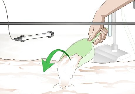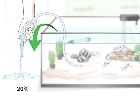 Do weekly partial water changes. For freshwater tanks, you’ll need to change about 20-30% of the water. Saltwater tanks generally need to be cleaned more. Use a suction wand to remove the water and pull out the debris from the substrate at the same time. Then, replace the removed water with fresh, treated water kept in additional buckets nearby.