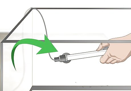 Install your heater. Most fish require that the water in your tank maintains a specific temperature, usually between 72 and 84 degrees Fahrenheit. However, some fish like goldfish are cold water fish and need lower temperatures. To keep the temperature regulated and steady, you’ll use a heater in your tank. Some heaters go under the gravel or other substrate. Others hang on the side of the tank. Follow the installation directions on the package. It’s important to place your tank near a functioning electrical socket, as you’ll need to plug in devices like your heater, light, and filter.