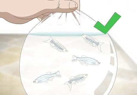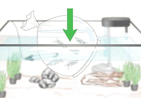 Float any new fish. Once you bring your new fish home, set the bag with them inside it in your tank for 15-30 minutes. Add ¼ cup of tank water into the bag and then reclose it and let it continue to float for another five minutes. Then, gently tip the bag into the water and watch as your fish swim away. Some fish, such as otocinclus, require drip-acclimation. To do this, tie a knot in air tubing and start a siphon by putting one end in the tank and sucking on the other end. Place the end you were sucking on into the bag with the fish. The water should slowly drip into the bag. Drip acclimate for about 30 minutes. Don’t skip this step as it helps to acclimate your fish to the new water qualities and temperature. It reduces the risk of shock.