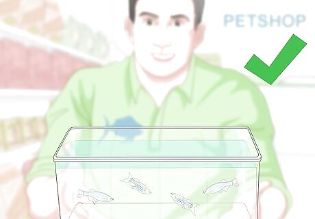 Go with a small breed. In many cases, small fish are peaceful breeds. They also require less tank space, making them a good choice for first-time fish owners. Neon tetras, zebra danios, and livebearers are all solid options. Be aware that some fish thought to be able to keep in bowls, like goldfish, can actually grow quite large. Ideally, the smallest fish tank you can keep is 3 gallons. If you go with a fish species that prefer to live in schools or shoals, like tetras, plan to purchase at least five of them at once. Schooling fish swim together, whereas shoaling fish only swim together when afraid. Both fish need companions to feel safe.