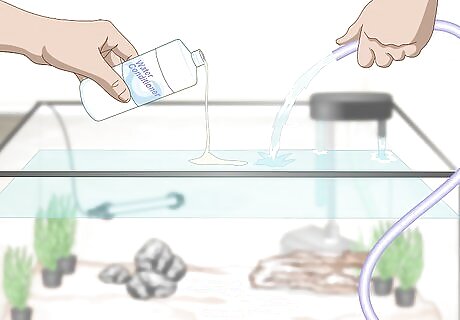 Condition the water and fill up your tank. Set aside enough water in buckets to fill up your tank. Treat the water with a de-chlorinating agent and wait until it takes full effect. The directions should be listed on the package. When the water is ready, gently pour it into the tank. Once the water is in your tank, put some fish food in and wait until brown beneficial bacteria is growing on the filter media. Test your water qualities. Once the ammonia and nitrites are 0ppm and the nitrates are below 20ppm, you can acclimate the fish. The tank usually will take six weeks to cycle, but the process can be sped up by adding beneficial bacteria or used filter media.