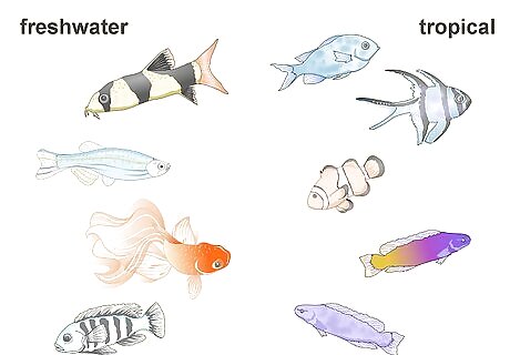Decide on freshwater or saltwater. Freshwater fish are the best choice for beginners, as they require less aquarium maintenance. They also generally have fewer health issues in home aquariums. Saltwater fish require saltwater aquariums and are more challenging to maintain. However, they are quite beautiful.