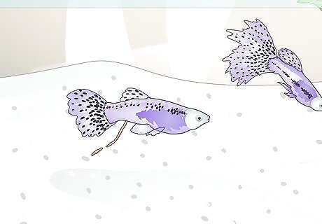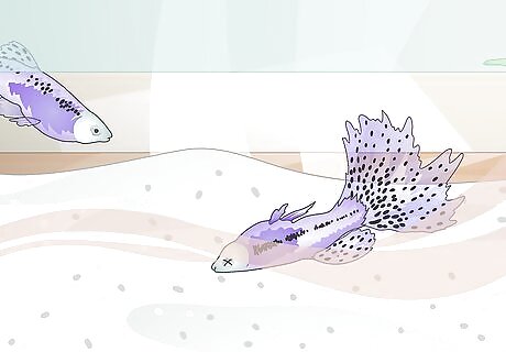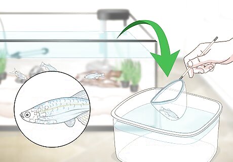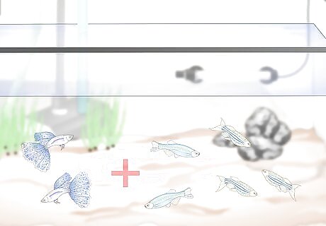 Treat any health problems. Watch your fish to ensure that they are swimming actively and maintaining a healthy coloring. They should be breathing freely and not gasping. Take a close look at their scales as well to ensure that no spotting or flaking is occurring. If you notice that one of your fish looks ill, scoop it out and isolate it in a separate tank for monitoring. Add needed medications. Make sure to remove any dead fish from the tank immediately. Most medications should never be added as a preventative measure.