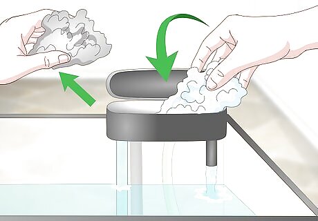 Clean your filter media if the filter is close to overflowing. Your tank filter can become clogged with debris, if left too long in the water. For most filters, you’ll need to pull them out completely and replace with new ones. However, in some cases, it’s possible to simply rinse the first filter media off with old tank water. Check your filter’s directions. Remember to only clean the first filter media; the one closest to the back. If you clean all of it, your ammonia and nitrite levels will rise because you removed all the beneficial bacteria.