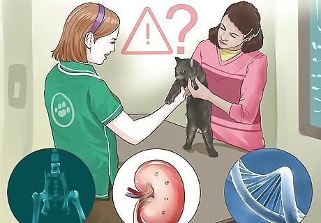 Watch for certain health problems. Like all breeds, Maine Coons need regular vet visits. However, they are prone to breed specific health problems. Watch for signs and symptoms of such problems and have them promptly treated by a vet. Maine Coons are prone to hip dysplasia, which can cause lameness. Maine Coons are prone to kidney disease, which can include symptoms such as bloody urine or stools, a lack of appetite, and a lack of energy. You also may want to have Maine Coons tested for genetic diseases, such as certain heart conditions, that are difficult to detect based on symptoms. Talk to your vet about whether your Maine Coon is at risk for inheritable disorders.