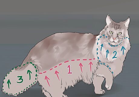 Brush your Maine Coon carefully. Strive to start brushing a Maine Coon when it is relaxed. This way, the experience will be calm for both of you. Start by brushing your cat's abdomen and legs. From there, you can brush the neck, chin, and tail. With a longhaired cat, you want to brush upward. Reward your Maine Coon with a treat or praise for behaving during a grooming session. You want your cat to come to look forward to being brushed, as brushing will occur each day.