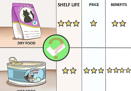 Decide on dry or wet food. Both wet or dry food can be a healthy option for a Maine Coon or any other cat. However, there are benefits and drawbacks to each to consider before selecting a food for your cat. If you're on a budget, dry food is generally a more economical option. It also does not spoil as easily. However, it's more calorie dense than wet food and may not be great for a cat with a weight issue. Canned food is generally more expensive, but has more protein and less carbohydrates. This could be helpful for a cat with a weight issue. If your Maine Coon has any specific health concerns, talk to a vet before selecting a cat food.