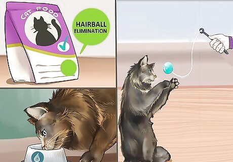 Minimize hairballs. Most long-haired cats are vulnerable to hairballs. Hairballs are rarely a serious medical concern, but you can take measure to reduce their severity for your Maine Coon's comfort. Look for a cat food formula designed to reduce hairballs. Make sure your Maine Coon drinks plenty of water. Keeping the water bowl away from the food bowl can help, as cats are hesitant to drink water near their food due to instincts. In the wild, an animal would not eat near water because they fear contamination. Keep your Maine Coon active. A healthy cat has a smoother coat, which can cut down on hairballs.