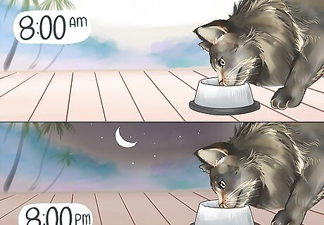 Stick to a feeding schedule. Maine Coons do have a tendency to overeat if free fed. A male Maine Coon should weigh between 15 and 25 pounds while a female should weigh between 10 and 15. It's a good idea to establish a feeding schedule for your Maine Coon cat. A feeding schedule can involve portion controlled feeding. This means giving your cat a specific amount of food once or twice a day. If your Maine Coon tends to overeat, this is the best option. Some people also use timed eating. You make food available for a set amount of time and then remove it. If your Maine Coon does not tend to overeat, timed feeding may work. One pound equals roughly 0.45 kilograms.