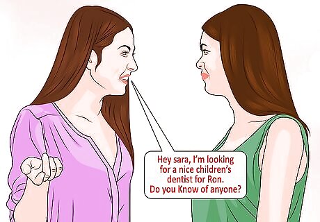Ask your friends and family. Talk to your friends or family members who also have children. They may be able to recommend a good pediatric dentist in your area. Reach out to parents. If your child is in school, or you take them to any interactive activities, talk to the other parents who are there. Try saying, “Hey Jill, I’m looking for a nice children’s dentist for Ron. Do you know of anyone?”
