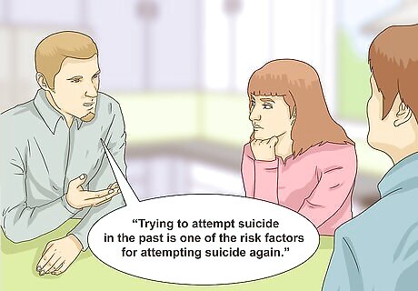 Talk about risk factors. There are some circumstances and situations in life that can make a person more likely to attempt suicide. When you are talking about preventing suicide you should talk about these risk factors. Doing so will help family members recognize when someone may be suicidal. Discuss previous suicide attempts. For example, you might say, “Trying to attempt suicide in the past is one of the risk factors for attempting suicide again.” Talk about bullying and abuse. Victims of these situations may be more likely to view suicide as an option. During the conversation bring up risk factors like suffering a loss and chronic illness.