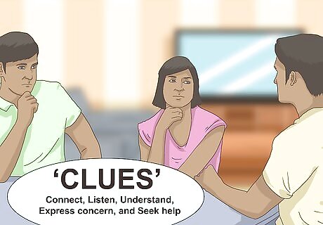 Discuss using ‘CLUES’. This acronym may help a family member if they ever need to assist someone that is suicidal. Make sure you remind them to: Connect, Listen, Understand, Express concern, and Seek help. Using the steps of this acronym will help family members know what to do to prevent a suicide. Tell family members to connect with the person to let the person know someone cares about them and what happens to them. Remind family members to listen and that they don’t have to say anything. Just being present can prevent a suicide. Talk to your family about trying to understand how a suicidal person may feel. Tell family members to try saying, “I can understand how upset and frustrated you are.” Talk about expressing concern for the person and what they are going through. For instance, saying something like, “I’m concerned about you and what you are thinking about doing.” Discuss when and how to seek help. Remind your family that the person's safety is the top priority and it’s okay to call a crisis hotline like 1-800-273-8255 or 911 if you think the person is seriously ready to attempt suicide.