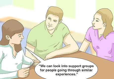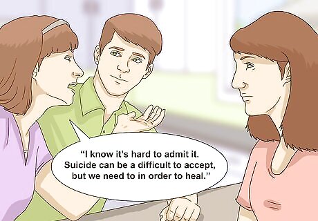 Discuss seeking help. Family members may need assistance with various things during this time. You or your relatives may need someone to talk, to handle everyday tasks, or to help with coping with the suicide. Talk with family members about when and how to seek help. Tell family members that it’s okay to ask a counselor, religious leader, or friend for support. Say something like, “There are people like grief counselors that can help us work through this.” Talk to the family about joining a support group or online forum. For instance, you might say, “We can look into support groups for people going through similar experiences.”