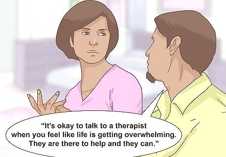 Talk about getting professional help. Let family members know that it’s always okay to seek help from a therapist or counselor for issues like suicide. Professionals can help by teaching stress management techniques, listening, and providing other support. You could say something like, “It’s okay to talk to a therapist when you feel like life is getting overwhelming. They are there to help and they can.” Or, you might try saying, “Consider talking to a grief counselor about our cousin’s suicide. It could help you cope.”