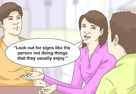 Include warning signs in the conversation. You can do a thorough job of talking about suicide prevention within the family if you talk about how to recognize the signs that someone may be considering suicide. Discuss clear signs like purchasing a weapon, prescription drugs, or talking about suicide. Talk about things like the person giving away prized possessions. For example, you could tell family members, “It may be a sign that they’re suicidal if someone is giving away things they love for no reason.” Mention signs like withdrawing from activities and becoming more isolated. You might say, “Look out for signs like the person not doing things that they usually enjoy.”