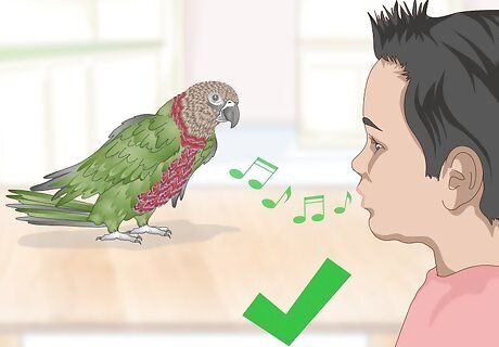 Sing to the parrot. Parrots also respond well to hearing words sung aloud. Sing your favorite song lyrics to the parrot so it can listen and mimic you. Repeat the same lyrics several times a day so the parrot catches on. For example, you may sing the lyrics to your favorite pop song to the parrot so it learns to speak the words aloud.