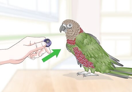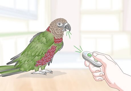 Use a clicker to reward the parrot. You can also use clicker training to reward the parrot. Hold a small clicker in one hand. When the parrot speaks, click the clicker once so it hears that it went off. Then, offer the parrot a treat. The clicker can act as a trigger for the parrot to remind them that their behavior is positive and good.