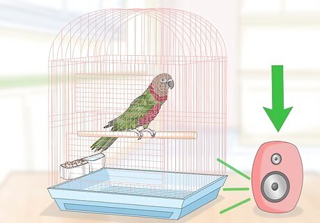 Play the radio for the parrot. The radio is a great way for the parrot to listen and mimic others speaking, especially when you are not home. Put the radio on a popular music station so the parrot can listen and mimic the songs. It may also mimic the radio DJs and other voices on the station, such as radio ads.