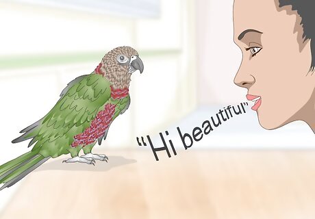Use an energetic, upbeat tone. Speak to the parrot in a tone of voice that is positive and friendly. The parrot will then mimic your tone and say words in an upbeat voice. A high voice will be easier for your parrot to mimic. For example, you may say "Hi beautiful" or "Lunchtime" in an upbeat tone, lifting your voice upwards at the end of each word.