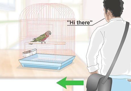 Talk to the parrot as soon as you get home. When you arrive home, greet the parrot by saying “Hi there” or “Hello beautiful.” The parrot will be the most attentive when you first get home, as it will be excited to see you. Chat to the parrot so it can listen to you and pick up on the words that you say. For example, you may say to the parrot, “How was your day?” or “Let me tell you about my day.”