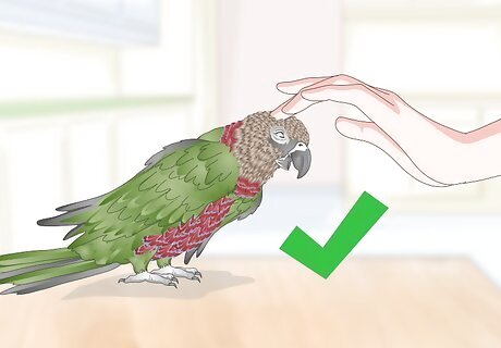 Pet or cuddle the parrot as a reward. You can also use physical affection as a reward for the bird's chattiness. Use your fingers to gently pet the top and sides of the bird's head. If your parrot likes to be cuddled, hold it in your arms on its side or so its head rests on your chest for a cuddle.