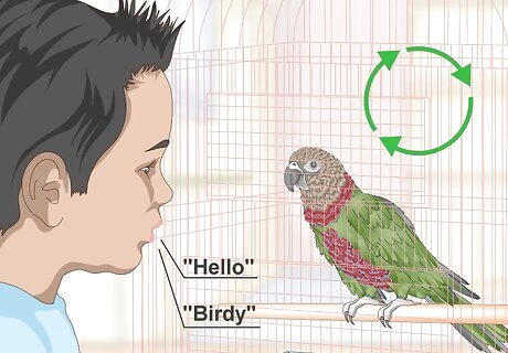 Say easy words to the parrot on a regular basis. Repeat words that are short and easy to the parrot so it can listen and mimic you. Words like “hello,” “birdy,” “lunch,” and “play” are all good options to get the bird started. Try saying “lunch” every time you feed the bird or “play” during every play session. Over time, the parrot should start to mimic you. Birds learn faster when they really want something, so using treats and rewards works well.