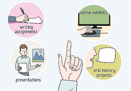 Avoid creating assignments that only test memorization skills. Instead, create assignments that show you what students can do with what they know, rather than how much they can know at any given time. Writing assignments, presentations, online exhibits, or oral history projects, for example, give students an opportunity to dive deeper into historical subjects and concepts that reveal something new about the past. If you are teaching an art history class to middle school students, for example, instead of creating a multiple-choice test to see how many artists’ names students can remember, you could have each student contribute to an online exhibit about a specific period or artistic movement. Assign each student a different artist and have them select a few images to display on the site, write a short bio on the artist, and explain why and how their work was historically significant. For example, if you are teaching a high school European History class, instead asking the students to recite the definition of nationalism on a test, split the class into groups and assign a country. Have each group work together to create a presentation defining nationalism and explaining its development and impact on each country. Students will get a deeper understanding of what nationalism means and how it developed and impacted European countries differently over time.