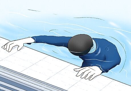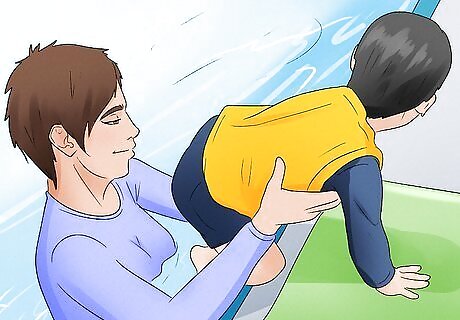 Help your toddler learn how to get out of the water with a pad. Place a pad along the outside of the pool. Lift up your little one so they can grab and climb onto the side wall. Encourage them to climb up and onto the pad, so they‘re completely out of the water. Don’t place your child on the pad right away. Instead, encourage them to climb up and out of the water on their own, while you hold onto their hips for support.