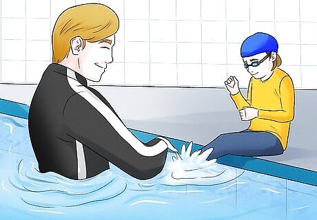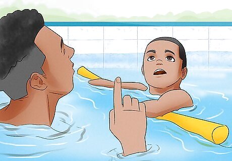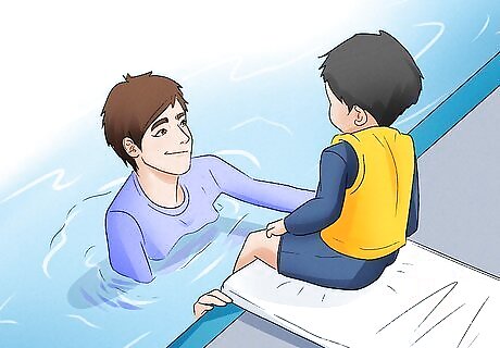 Encourage your child to swim a short distance on their own. Stand next to your child in the water and encourage them to swim across part of the pool, for about 25 yd (23 m). Remind them to swim towards an exit, where they can climb out of the pool on their own. If your child is still getting used to the basics, encourage them to swim a shorter distance.