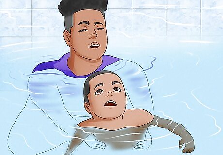 Guide your toddler's hips to help them turn. Give your little tike a lot of encouragement, telling them to turn themselves in a circle. Place your hands lightly on your child’s hips to help them get the hang of spinning in the water. Don’t spin them too much—just enough so they get the hang of what’s going on.