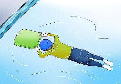 Help your little one swim on their own with a support. Give your child a kickboard or other flotation aid they can hold onto while in the water. Encourage them to swim a short distance on their own by kicking their legs behind them. This is a great way for your little one to get the hang of kicking in the water.