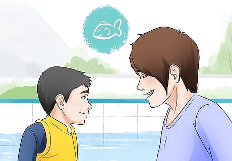 Encourage your kids to “talk” to the fish so they’re used to the water. The water can be intimidating for little tikes, especially if they’ve never taken a dip before! Carry your child into the water and teach them to blow bubbles into the water as a way to “talk” to the fishies down there. Then, help them place their ear along the water to “listen” for a response. Always look happy and excited as you’re blowing bubbles in the water. This will help your child feel a lot more encouraged and confident!