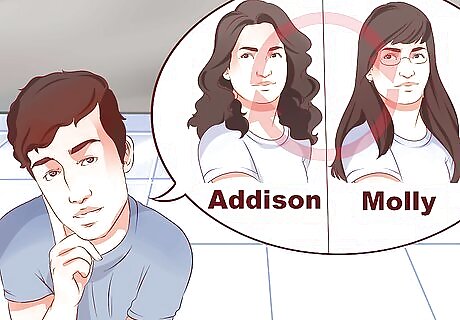 Learn to associate a twin's name with a certain characteristic. If you've found any distinguishing characteristics between twins, try to associate these differences with a twin's name. This can help you quickly tell the twins apart without having to scramble to think. One twin may have curly hair, for example, while the other has straight hair. Try to repeat to yourself, "Addison, curly, Molly, straight, Addison, curly, Molly straight." This will help solidify the connection. The next time you see one of the twins, you'll be able to quickly differentiate based on hair type.