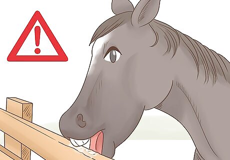 Watch to see if the horse is crib-biting. Cribbing is when a horse bites something with its teeth, arches its neck, and then makes a sort of grunt. Cribbing is a sign that a horse is stressed out and unhappy. If your horse chews, gnaws, or cribs, it is likely stressed. You should consult a veterinarian if your horse exhibits this behavior often. Horses will usually bite onto stall doors, poles, or other hard objects when cribbing.