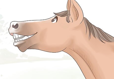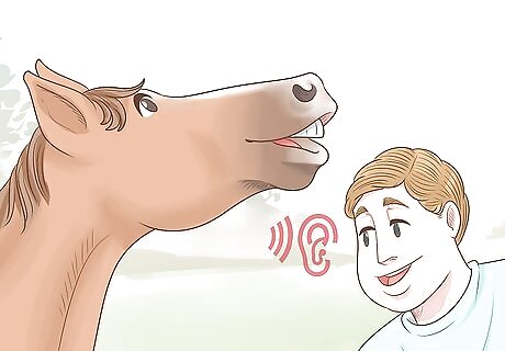 Pay attention to nickering. If your horse does a light nicker while being alert, having a raised head, and pointing their ears in your direction, they may be happy. Your horse may nicker when you're bringing food or treats to them. They may also nicker if they're excited to see you or another horse. If nickering becomes more intent, high pitch, or seems stressed, it could be a sign your horse is unhappy.