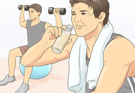 Hydrate before and during exercise. Dehydration is often caused by excessive sweating during exercise. You should work on hydrating before you engage in a heavy workout. It's best to start hydrating the day before. Drink extra water if you know you'll be doing something like running a marathon the next day. Drink water until your urine is clear or pale yellow. While you exercise, carry a water bottle. Make sure to take sips of water on occasion while you're working out to replenish the fluids lost through sweat. If you’re an active person, you should have 2–3 glasses of water a few hours leading up to your workout. While you’re exercising, have a glass of water every 10–15 minutes to help replenish your body. Afterward, have another 2–3 glasses.