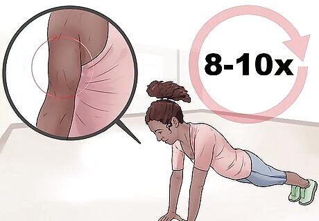 Focus on your triceps. The triceps are the muscle group on the backside of your arm. This is a common area to want to tone and define with both yoga and other arm exercises. You can try: Try diamond push-ups. A great total arm exercise to try are diamond push-ups. Because of the central hand position, this is a slightly more difficult exercise, but great for toning your arms. Repeat 8-10 times per set and aim for 2-3 sets if you can. Do tricep kickbacks. To tone up the back of your arm, focus on working your triceps. Kickbacks are a great exercise to strengthen and tone your triceps and backs of your arms. Do 8 reps per set and try to do 2-3 sets total.