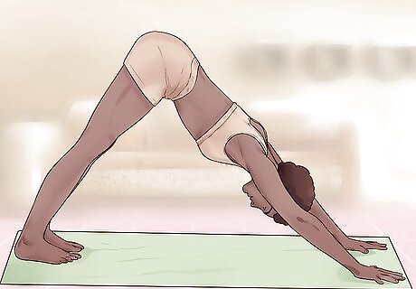 Ease into downward dog. One of the most common poses in yoga routines is downward dog. This is a great exercise to tone your arms. It requires you to keep your arms and shoulders firm and strong and over time gives your arms great definition. Start this position by getting onto all fours on your yoga mat or the carpet. Stack your hips over your knees and plant your palms firmly underneath your shoulders. Tuck your big toes under and lift your hips up and back to create length in your spine. Your body should be in an upside down "V" shape for downward dog. Try to straighten your legs and push your heels toward the ground. Push through your palms and engage your shoulders to move them up and away from your ears. Hold this pose for a few deep breaths and then move onto your next yoga pose.