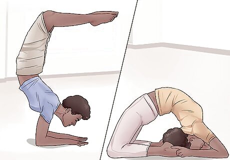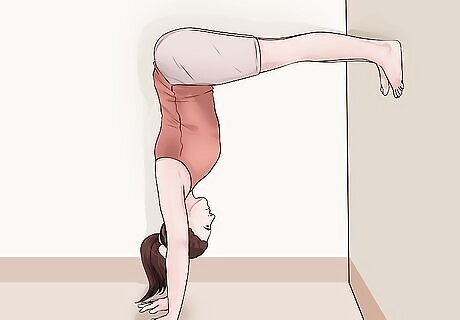 Get into an L-handstand. Handstands can be a difficult yoga pose to do. However, they're great at strengthening and toning your entire arm and shoulders. Wall handstands are a great alternative to a full handstand. Come into a downward dog position next to a wall. Your heels should be as close to the wall as you can get without them resting on the actual wall. Keep your palms firmly planted on the ground and keep your arms and shoulders firm and strong. Slowly, begin walking both of your feet up the side of the wall. Stop when your legs become parallel to the floor. Your body will be in an "L" shape. Press down through your hands to engage your shoulders. To avoid curving your spine, engage your core. Hold this position for a few deep breaths. Then, slowly walk your feet back down the wall into downward dog again.