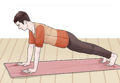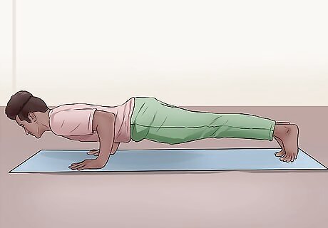 Try chaturanga. Another great pose to help strengthen your arms is chaturanga. This is a challenging pose, but is great specifically to tone the backs of your arms and shoulders. Start this pose by getting into a plank position. Slowly lower, keeping your upper arms flush with the sides of your torso, until your elbows are bent at a 90-degree angle. Pull your shoulders toward the back of the mat to keep them away from your ears. Try to keep your body completely parallel to the floor. Your hips and lower back should be straight in line with your legs and shoulders. Hold this pose for a few deep breaths. You can move into cobra or downward dog after this pose.